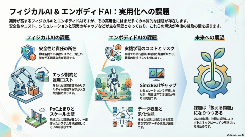 フィジカルAIとエンボディドAIは、期待が高まる一方で、現時点でもいくつかの本質的な課題を抱えています。