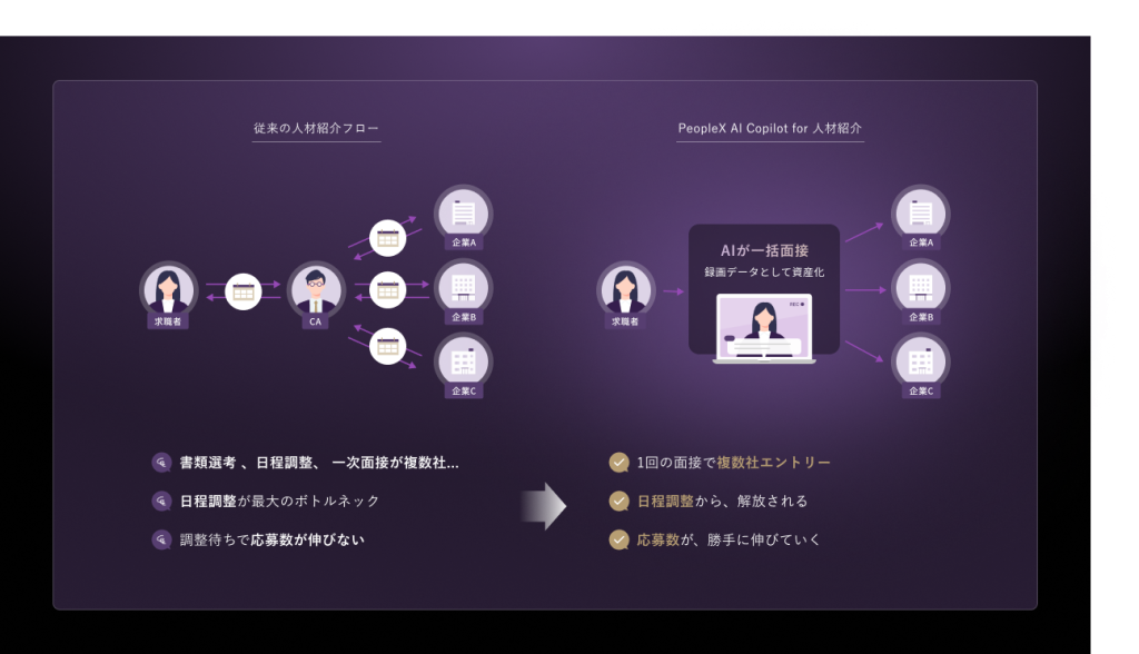 人材紹介業界における「AIエージェント」の導入は、単なる業務効率化を超えた構造的な変革を意味します。今回PeopleXが発表した「PeopleX AI Copilot for 人材紹介」は、この変革の象徴的な事例といえるでしょう。