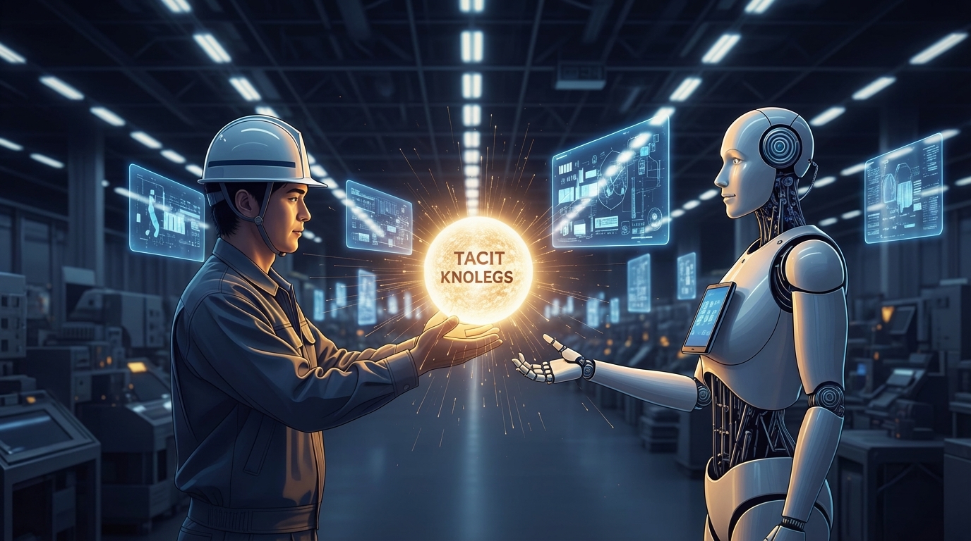 「暗黙知」とは、熟練した職人や技術者が体で覚えた勘やコツのように、言語化・数値化が難しい知識のこと。「形式知」とは、マニュアルや文書として誰でも参照できる状態に変換された知識である。製造業における技術継承の核心的な課題であり、本プログラムでは生成AIによってこの変換を促進することを目指している。