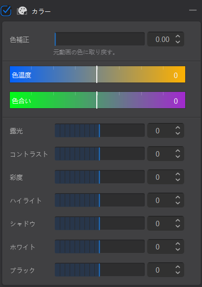カラーでは、露光、コントラスト、彩度など、基本的な色調補正が可能です。