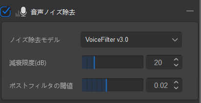 ポストフィルタは除去処理後に改めて取り除かれるノイズの設定で、閾値を下げるほど元の音まで削られやすくなり、上げると自然さは保たれますがノイズも残りやすくなります。