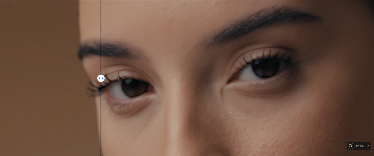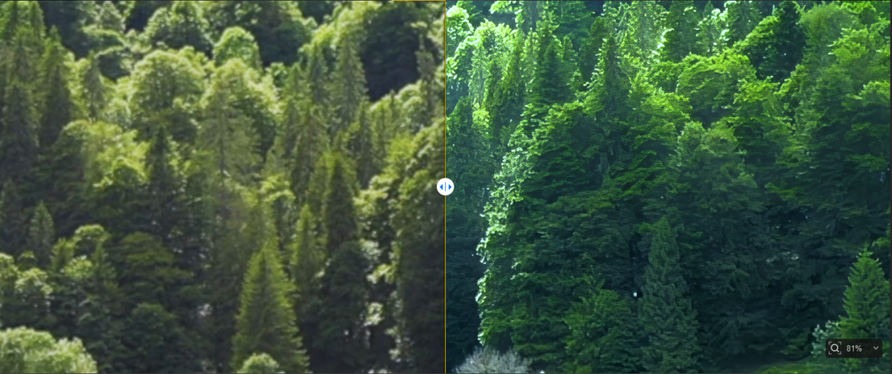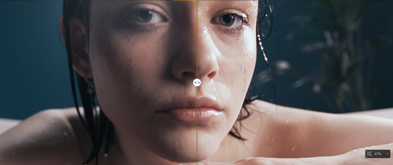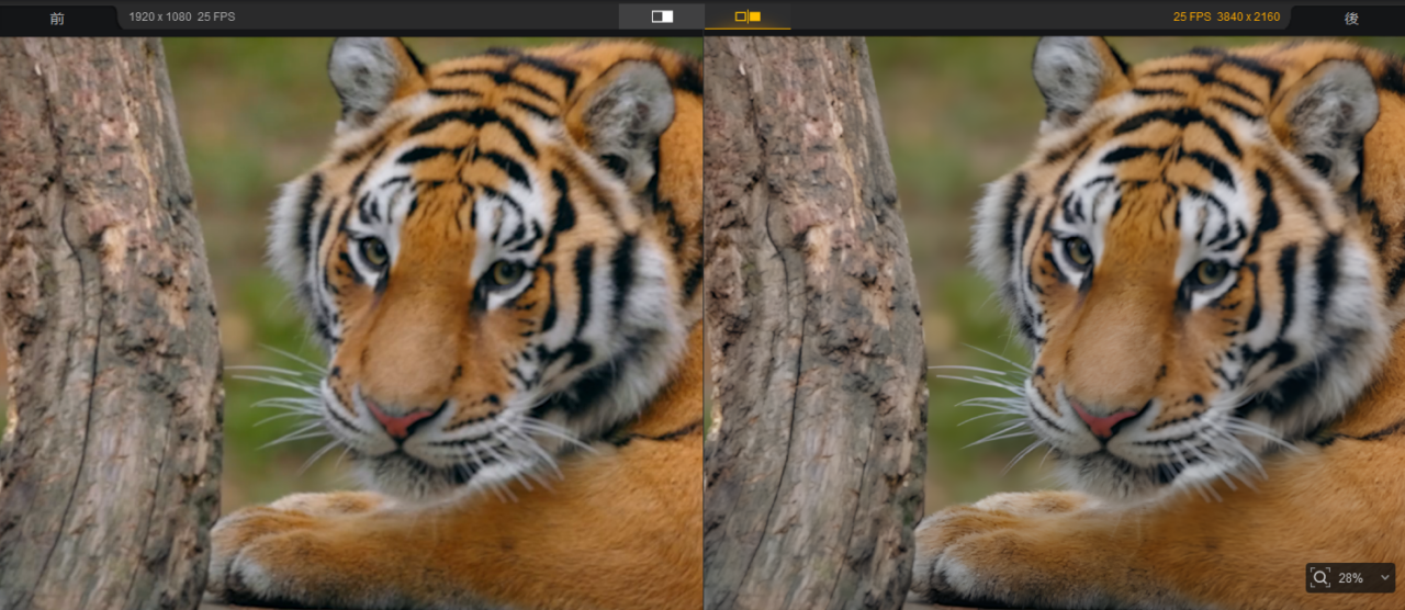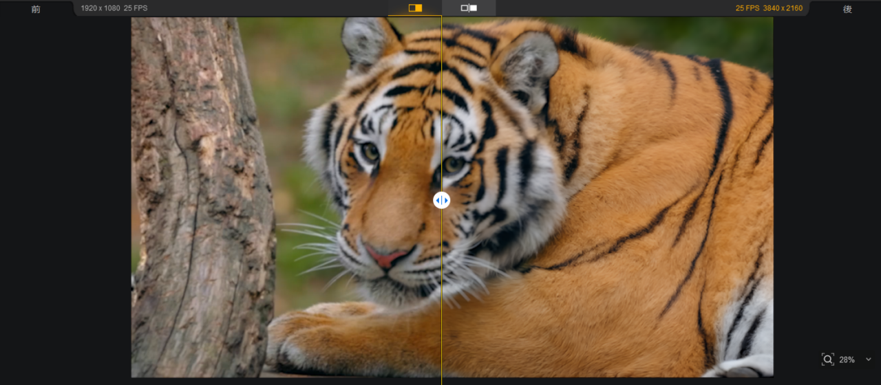 黄色の境界線の左側がオリジナル、右側がAI補正のプレビューとなっています。境界線は左右に動かすことができるため、補正後のイメージを簡単に確認できます。動画も、自由に動かしたり、拡大・縮小表示することができるため、ディティールの確認もできます。