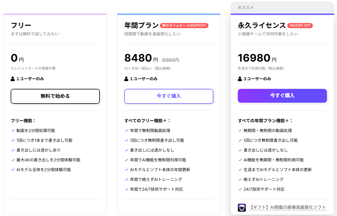 Aiarty Video Enhancerには3つのプランがあります。