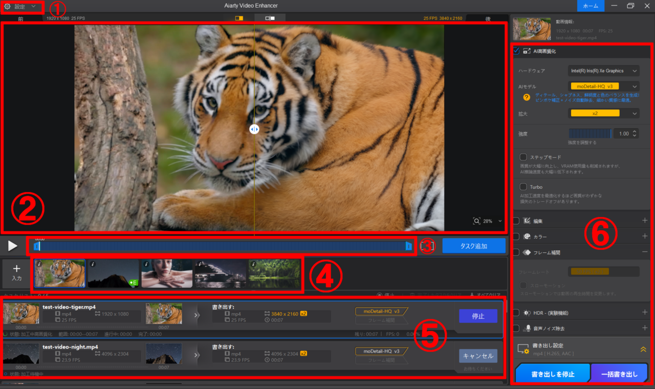 動画編集をする前に、高画質化と同時に、素材となる動画の必要なシーンだけを切り出したり、クロップしたり、複数の動画を一括で処理して完了まで放置といったこともできるので、複雑な動画編集のお供として優秀だと思いました。