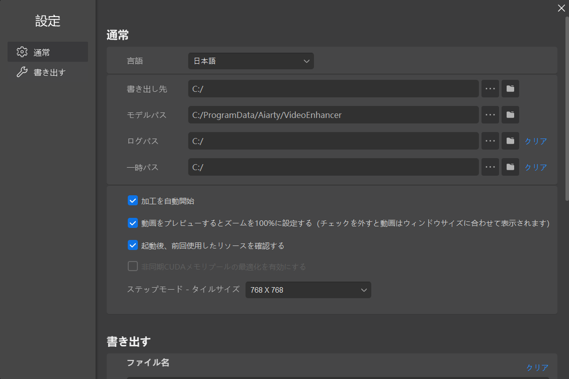 保存先や、書き出し時のデフォルト設定などを変更できます。