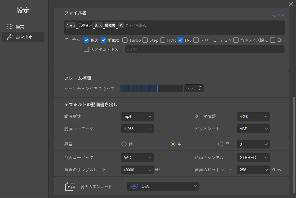 書き出し設定