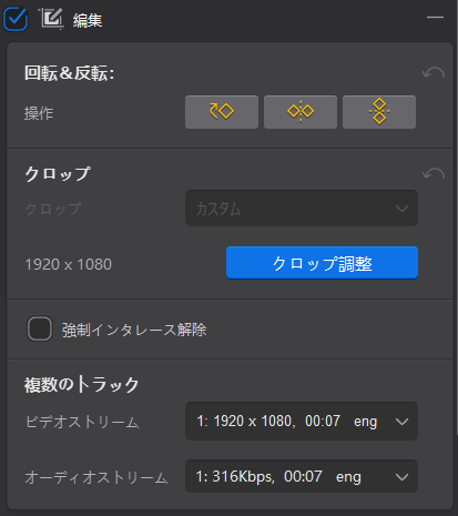 編集では、回転・反転、クロップなどを行うことができます。