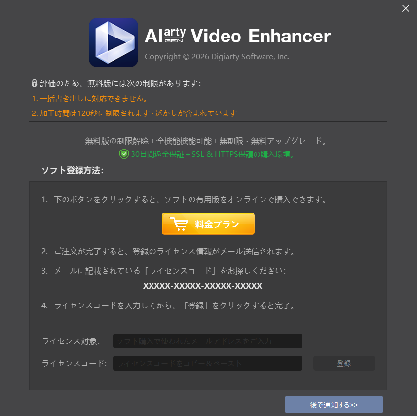 ライセンスキーを取得したら、Aiarty Video Enhancerを起動し、起動時のライセンスの確認画面か、画面左上の「設定」から「バージョン情報」から登録を行います、購入時のメールアドレスと、メールで送られてくるキーを入力して完了です。