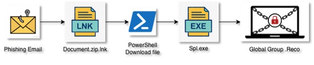 攻撃者はDocument.doc.lnkという名前のWindowsショートカットファイルを添付し、クリックするとcmd.exeとPowerShellを経由して178[.]16[.]54[.]109からspl.exeをダウンロードする。最終的にGLOBAL GROUPランサムウェアが展開される。このランサムウェアはMamonaの後継で、C2サーバーに接続せず完全にオフラインで動作する点が特徴である。ChaCha20-Poly1305暗号化アルゴリズムを使用してファイルを暗号化し、.Reco拡張子を付加する。