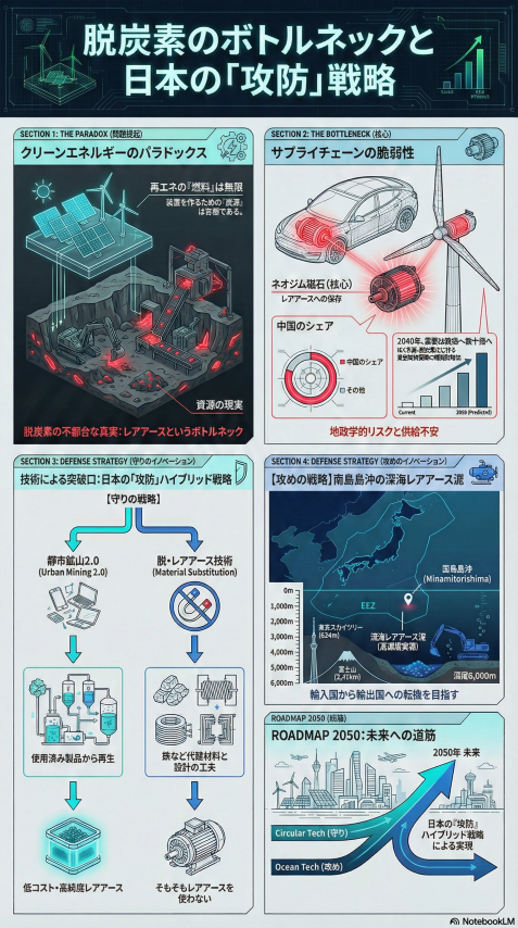 太陽光や風力といった「燃料」は無限ですが、それを電気に変えるための「装置(ハードウェア)」は有限の資源で作られています。本日は、エネルギー問題の核心にある「レアアース(希土類)」の争奪戦と、それを技術で突破しようとする日本のイノベーション(守りと攻めの戦略)について解説します。