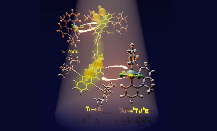 光の吸収または発光の際に電子のスピン(量子力学的な自転方向)が反転する性質を持つ発光分子。このスピン反転により、SFで生成された三重項エキシトンのエネルギーを選択的に受け取ることができる。今回はモリブデン(Mo)を中心金属とする錯体がこの役割を担った。