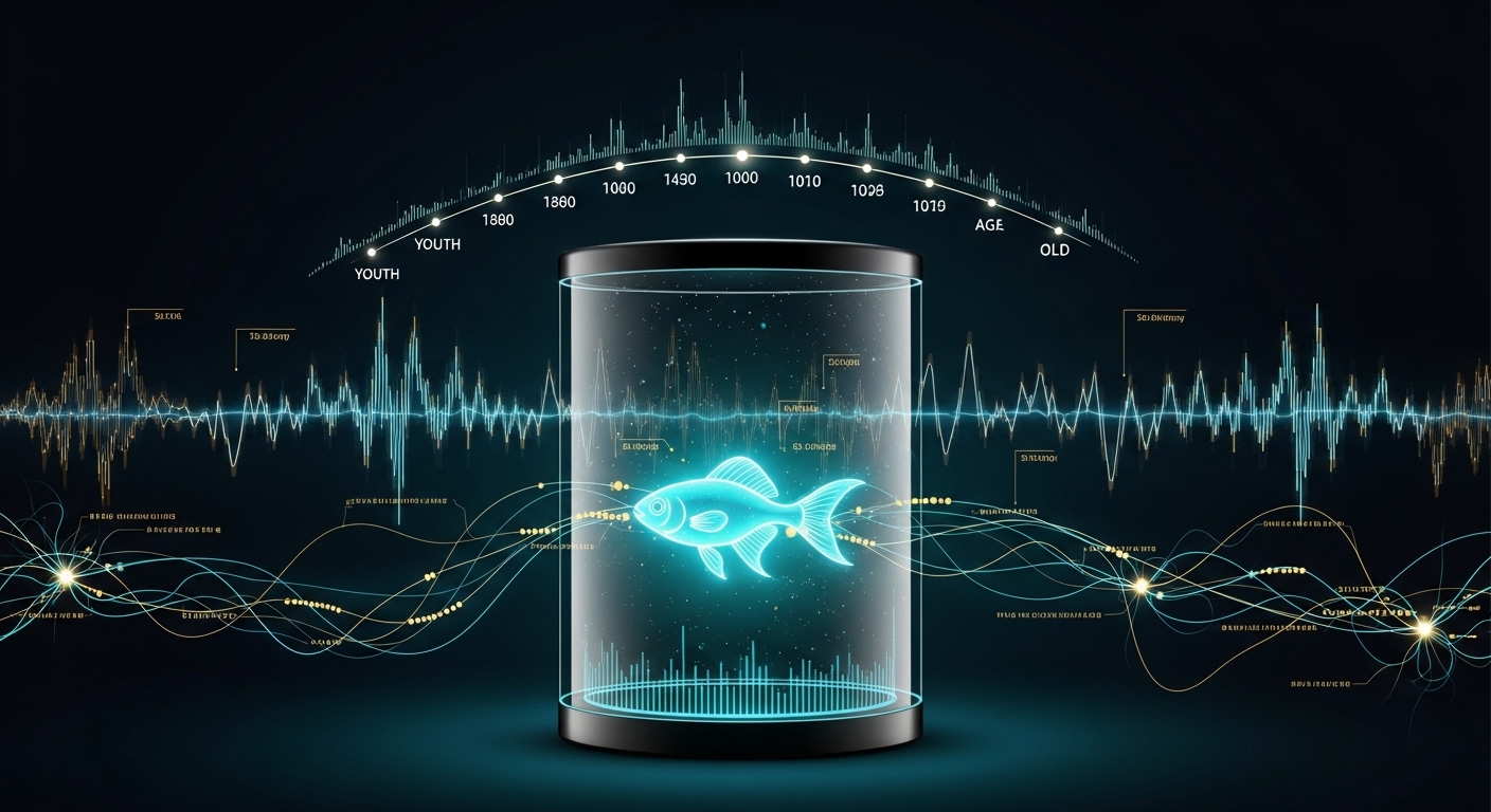 アフリカン・ターコイズ・キリフィッシュは、寿命が4〜8ヶ月という脊椎動物です。複雑な脳を持ちながらも、研究室の「一生」が数ヶ月で完結するため、個体の生涯を丸ごと観察するという前例のない実験が可能になりました。81匹の魚を個別のカメラ付き水槽に入れ、青年期から死まで24時間365日記録し続けたこの研究は、映画「トゥルーマン・ショー」の科学版とも評されています。