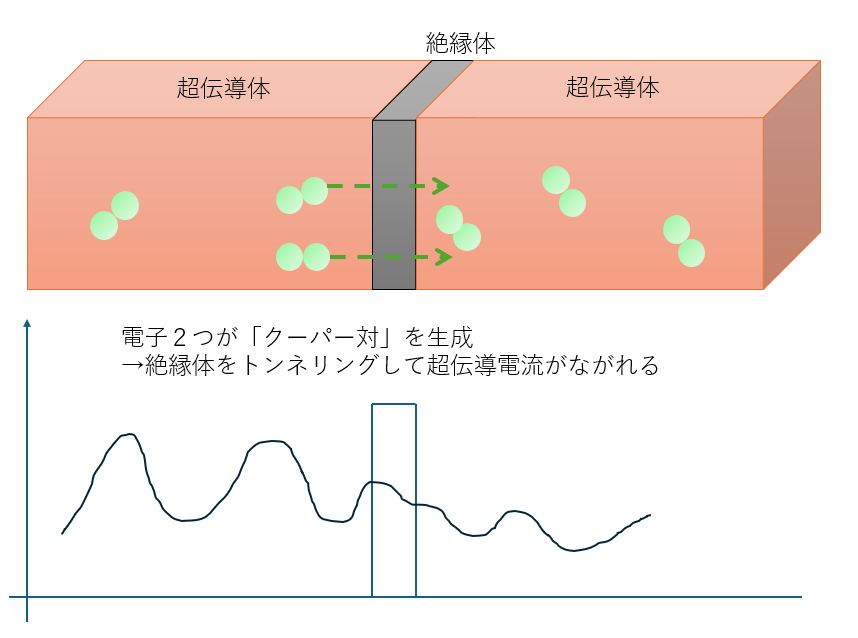 その理由の一つは、量子ビットの中核となるジョセフソン接合を機能させるためです。ジョセフソン接合は、超伝導体どうしの間に非常に薄い絶縁層をはさんだ構造をもちます。超伝導状態になると、電子は2個ずつ結びついたクーパー対を作り、このクーパー対が絶縁層を通り抜けるトンネル効果を示します。しかもこの現象は、1個1個の電子ではなく、多数の電子がまとまった量子状態として振る舞うため、「巨視的なトンネル効果」として観測されます。超伝導量子ビットは、このジョセフソン接合の性質を利用することで、量子ビットとして使いやすい2準位系を作っています。