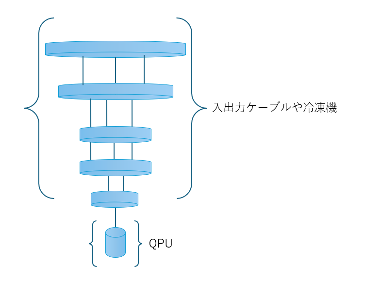 上の写真のように、量子コンピュータではQPUそのものよりも、むしろそれを取り囲む冷却装置のほうが大きな割合を占めています。超伝導量子コンピュータは、絶対零度付近の極低温まで冷やして動作させます。見た目には「なぜここまで冷やす必要があるのか」と感じますが、これは超伝導量子ビットを正しく働かせるために欠かせない条件です。