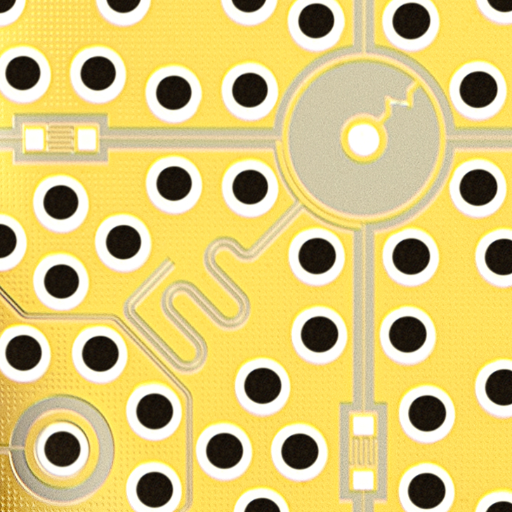 Copyright; RIKEN Center for Quantum Computing : 理化学研究所の量子コンピュータのQPUの拡大イメージ。右上にある大きい円形のパターンが量子ビットで量子ビット同士は、画像左上と右下の四角いパターンで書かれているキャパシタで結合している。