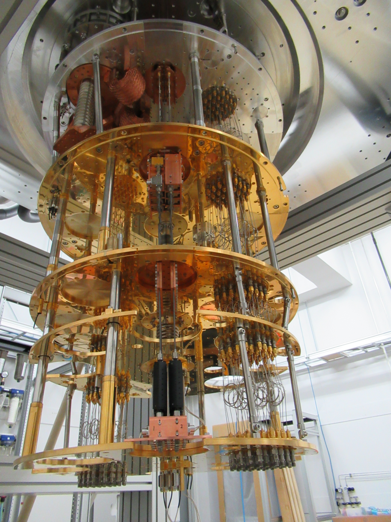 実際にはQPUそのものは非常に小さく、装置の大部分は冷凍機や配線、制御系が占めている。