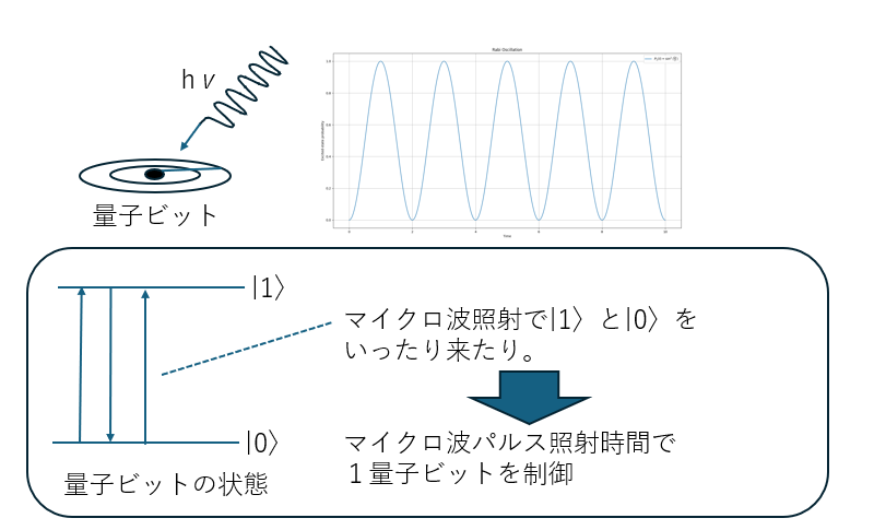 また、量子ビットを制御する際には、|0⟩状態と|1⟩状態のエネルギー差に対応する周波数のマイクロ波を照射します。すると、2つの準位の間で確率振幅が周期的に変化する「ラビ振動」が起こります。この現象を利用することで、1量子ビットの状態を制御できます。
