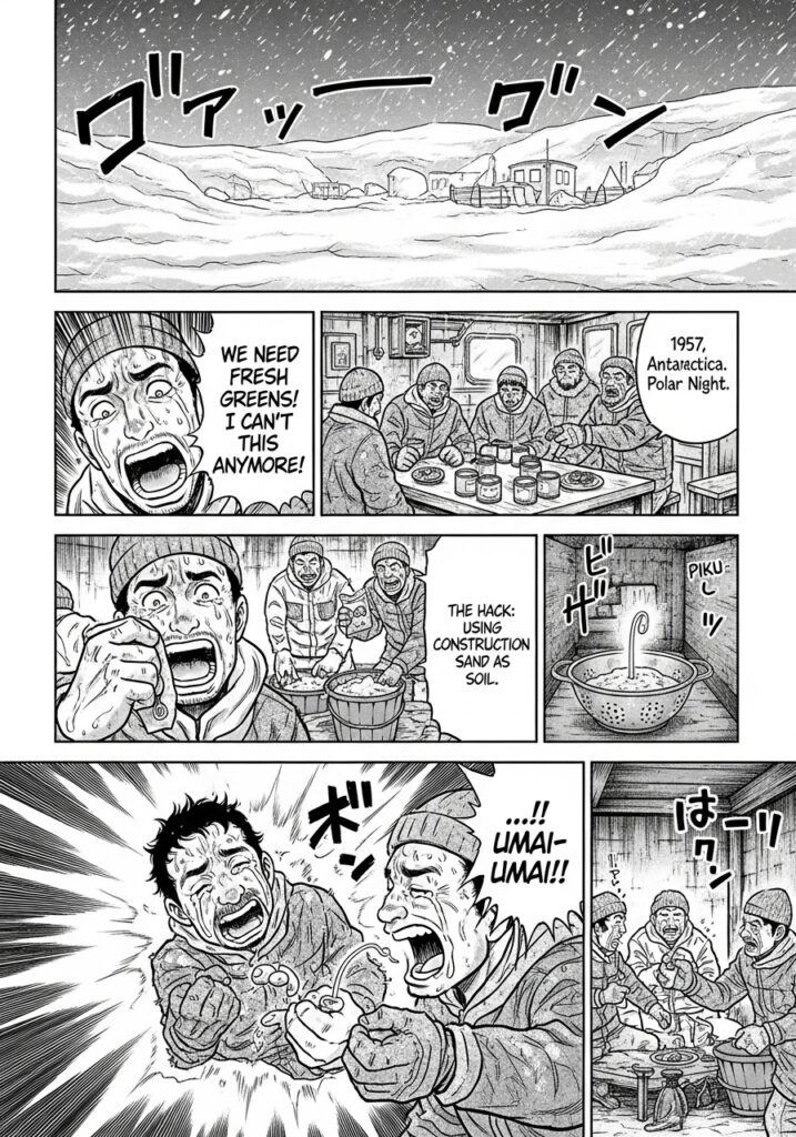 - 資源の完全循環(Circular Economy): 昭和基地は「排水一滴すら外に出さない」ことが求められる世界。水耕栽培(ハイドロポニックス)の水は循環利用され、肥料の濃度もセンサーで管理されています。