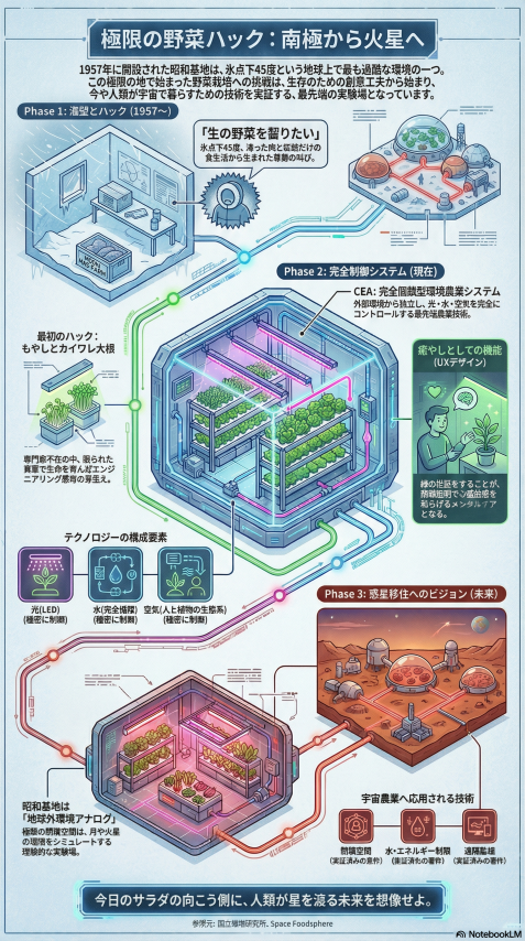 JAXAやNASAが進める「月面農場」や「火星移住計画」。 そこで必要とされる技術要件――「閉鎖空間」「限られた水とエネルギー」「遠隔監視」「メンタルケアとしての農業」――は、昭和基地ですでに実証実験が繰り返されてきたものです。