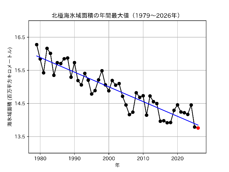 JAXAと国立極地研究所(NIPR)は2026年4月17日、2026年の北極の冬季海氷域面積が3月13日に1,376万平方キロメートルを記録し、衛星観測が開始された1979年以降で最小となったと発表した。