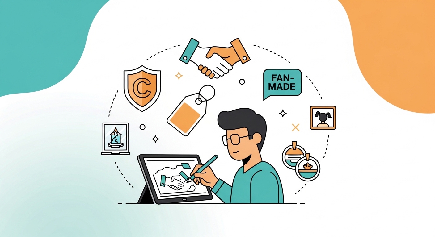 既存のマンガ、アニメ、ゲームなどのキャラクターや世界観をもとに、ファンが新たに制作する創作物の総称。同人誌、ファンアート、グッズなど形態は多岐にわたる。日本の著作権法上、権利者の許諾なく行う場合はグレーゾーンに位置づけられてきた。