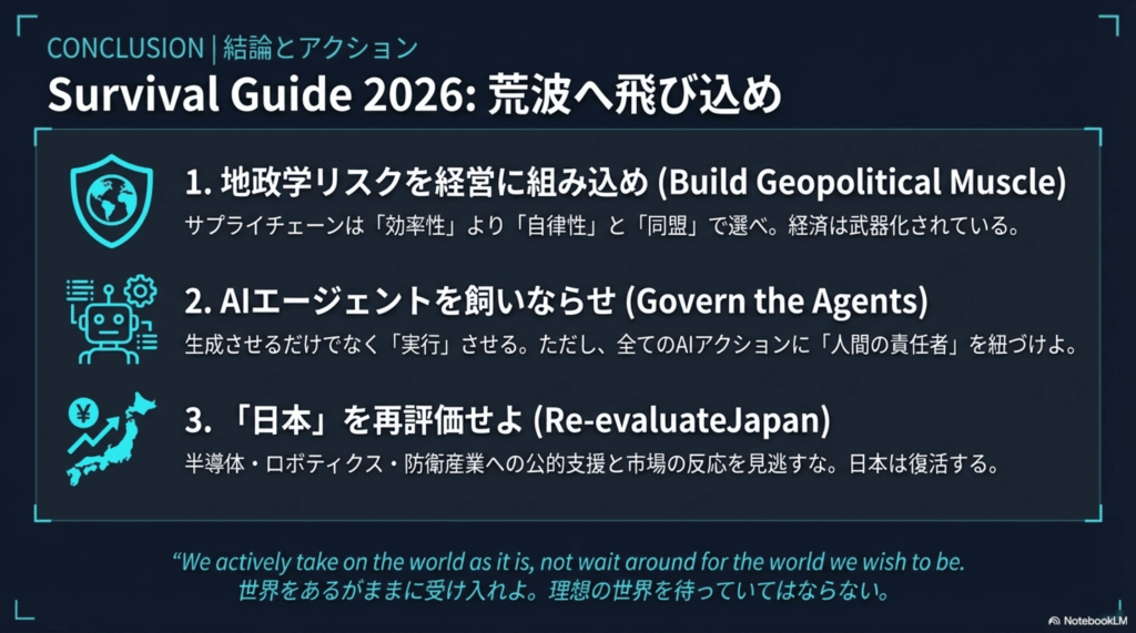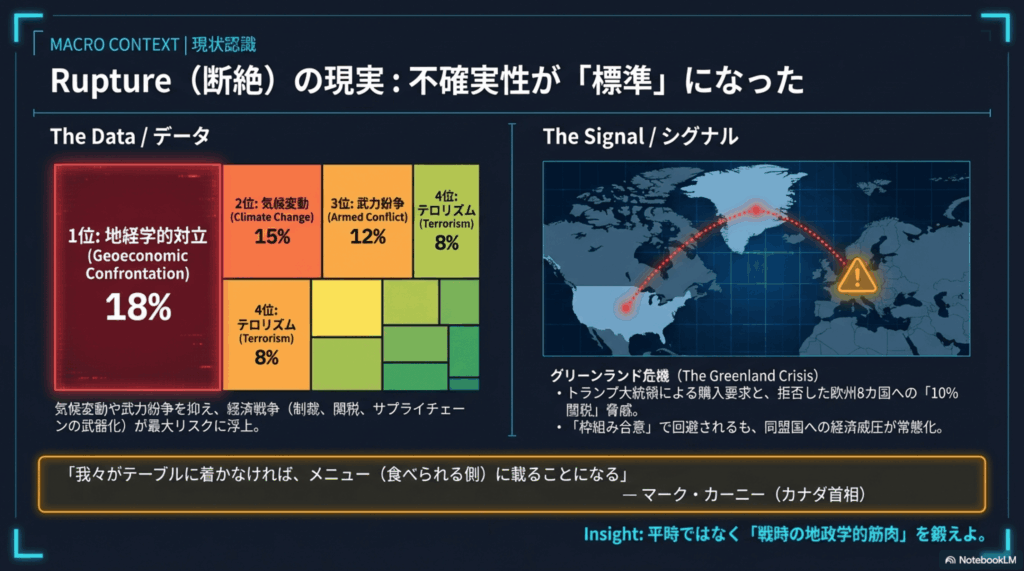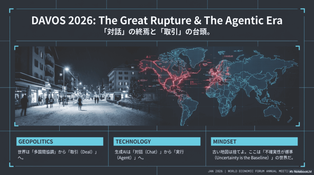 ダボス2026が突きつけた現実は、「誰も助けに来てくれない世界」です。多国間協調の繭は破られ、我々は「取引(Deal)」と「実力(Muscle)」が支配するジャングルに放り出されました。