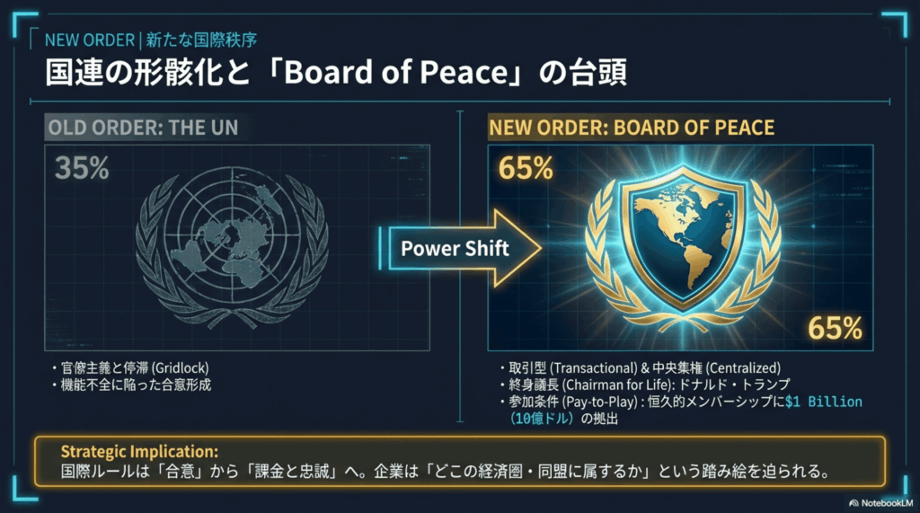 トランプ米大統領主導の「Board of Peace(BoP)」は、国連体制を無効化する新秩序の象徴です。トランプ氏が「終身議長」として独占的な決定権を握り、恒久的な席を得るには10億ドル(約1,500億円)の拠出金が必要という「Pay-to-play(金で参加権を買う)」構造は、平和さえも取引対象であることを示しています。 - グリーンランド・ディールの裏側