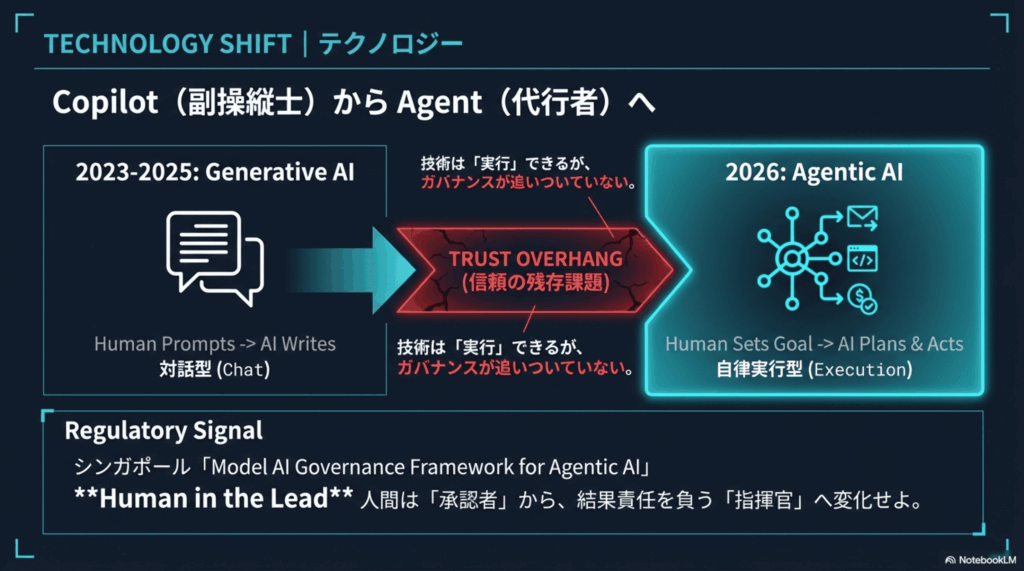 AIの実行能力が、組織の統治能力(Trust)を遥かに凌駕しています。例えば、AIが複雑な規制をわずか3日で解析し、1億2,000万ドル(約180億円)の節税に成功した事例が出る一方、既存のガバナンスはこの超高速な意思決定に追いついていません。 - 「Human in the lead」への移行