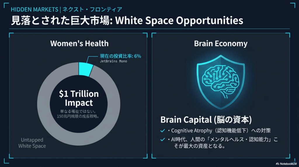 現在、投資のわずか6%に過ぎないこの領域は、2030年までに1兆ドル(約150兆円)の経済効果を生むと予測されます。心血管疾患、骨粗鬆症など4領域だけで、米国市場のアドレス可能な市場(TAM)は1,000億ドル(約15兆円)を超えます。これを見過ごすのは経済的合理性の欠如です。 - Brain Economy(ブレイン・エコノミー):認知資本への投資