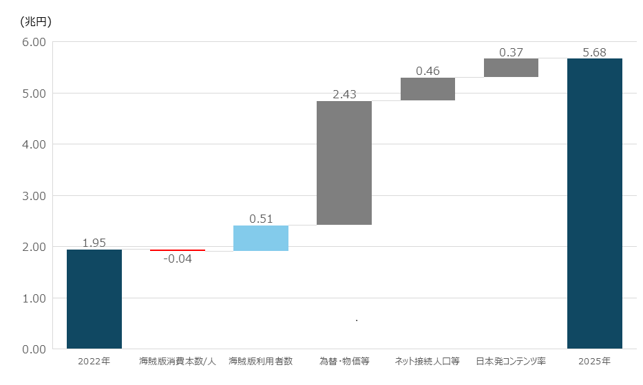 一人あたり海賊版消費本数は減少したが、為替・物価変動、海賊版利用者数やネット接続人口の増加、日本発コンテンツの世界的な浸透の加速等により被害額は増加した。