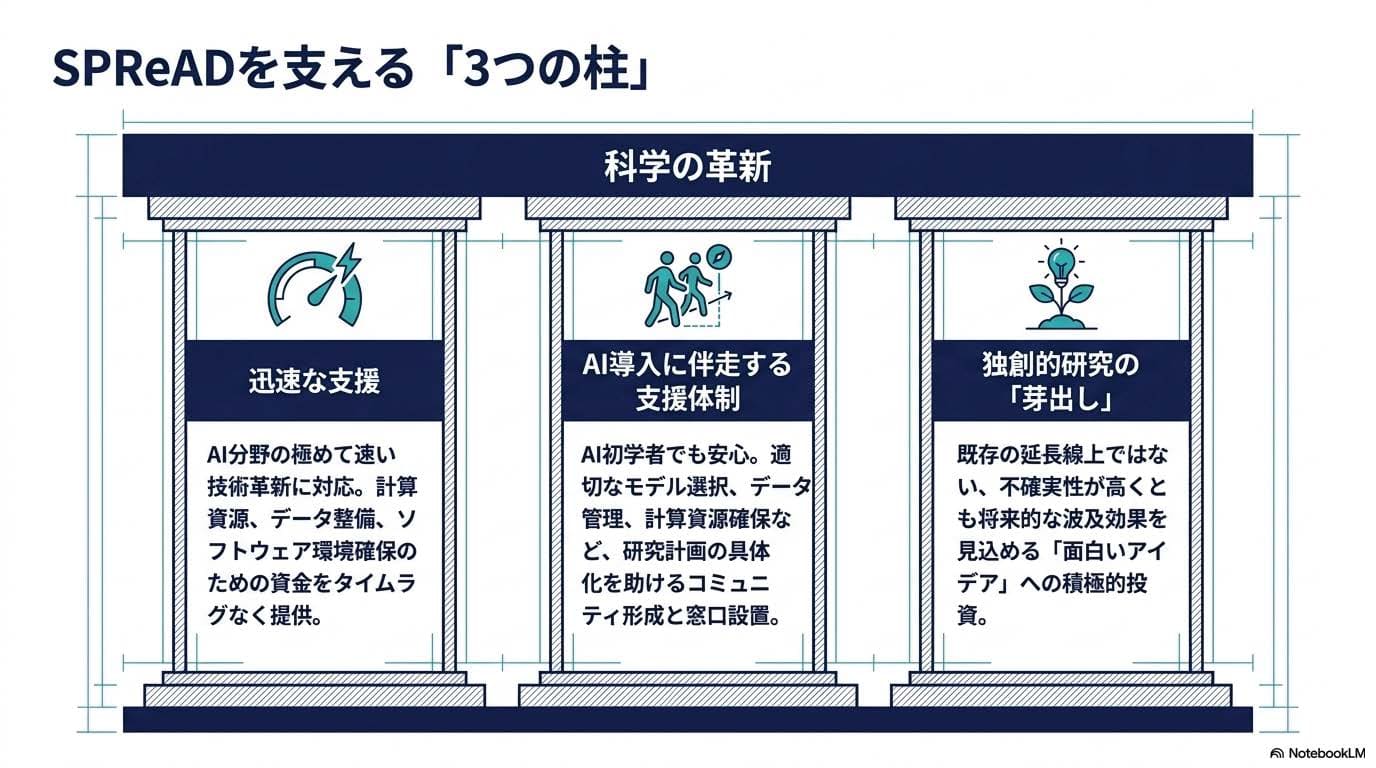 SPReADの公式名称に含まれる「1,000 Discovery challenges」という表現は、この「発見の担い手を増やす」という設計思想を端的に表しています。成功率よりも、挑戦の総量を最大化する。1,000という数字は、単なる採択枠ではなく、第5のパラダイムに1,000通りの入り方を用意したとも読めます。