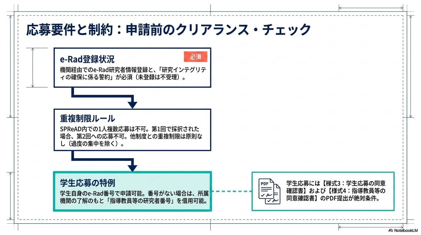 半月かけて練り上げた研究計画書が、最後の最後、スクショ一枚の条件違反で受理されない──そんな事態は、本人にとって痛すぎますし、SPReADという制度にとっても痛い損失です。だからこそ、深堀版ではこの「手続きの落とし穴」をあえて太字で書きました。