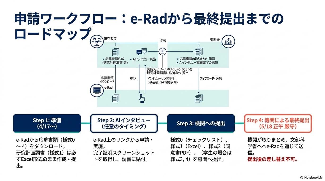 - e-Rad提出:2026年5月18日(月)正午までに、すべての書類をアップロードして完了です。