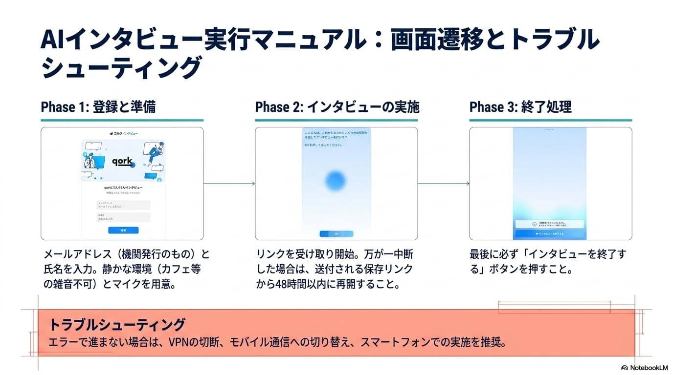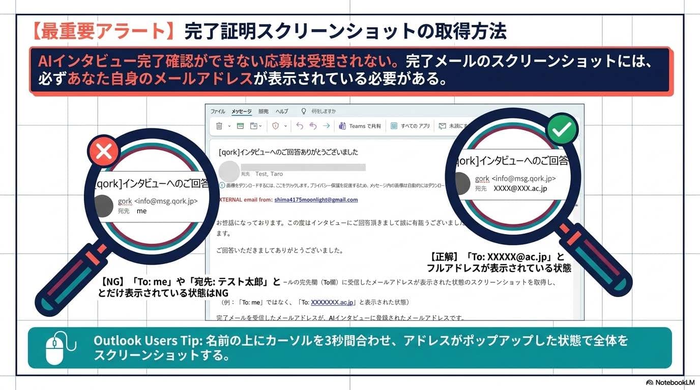 - 完了メールのスクリーンショット保存:インタビュー完了後に届く完了メールの、「宛先(To:)」欄に研究代表者本人のメールアドレスが表示された状態のスクリーンショットを必ず取得します。これを研究計画調書に貼付しなければ受理されません。登録アドレスは必ず所属機関発行のものを使い、調書に書くアドレスと完全一致させてください。