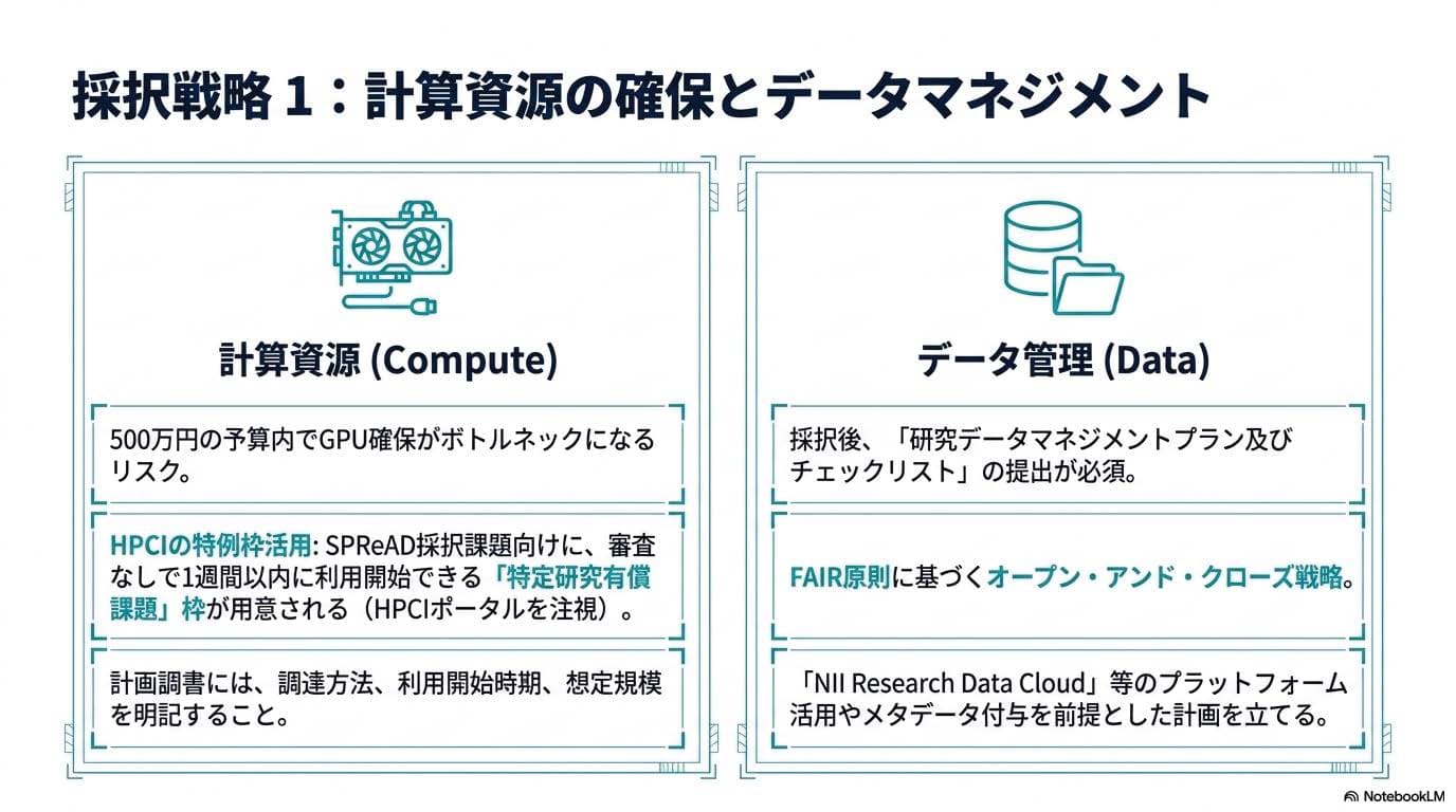 自前のGPU環境を持たない研究者でも、採択されればすぐに「富岳」をはじめとする国家規模の計算資源に手が届きます。500万円の直接経費をクラウドGPUで溶かす前に、このルートを前提に設計するのが定石です。申請書にも「HPCIの特定研究有償課題の活用を想定」と明記すると、設計思想の解像度が伝わります。