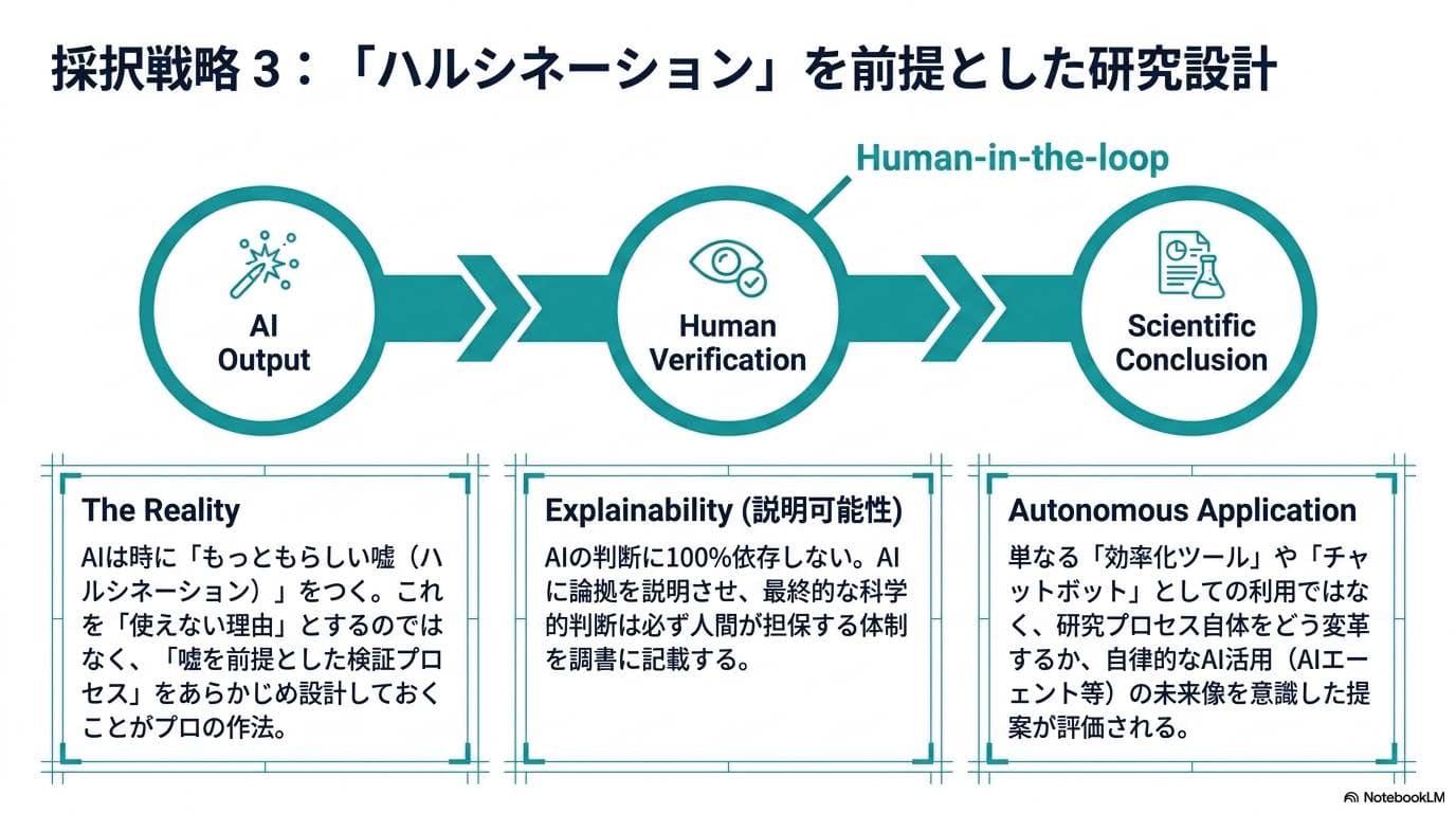 具体的には、AIの出力に対して、①一次文献での裏取り、②複数モデルでのクロスチェック、③人間専門家によるレビュー──といった多段階の検証フローを、申請書の「研究計画」欄に書き込みます。最終的な科学的判断は、常に人間が担う。その覚悟が見える計画書は、審査員の安心感に直結します。