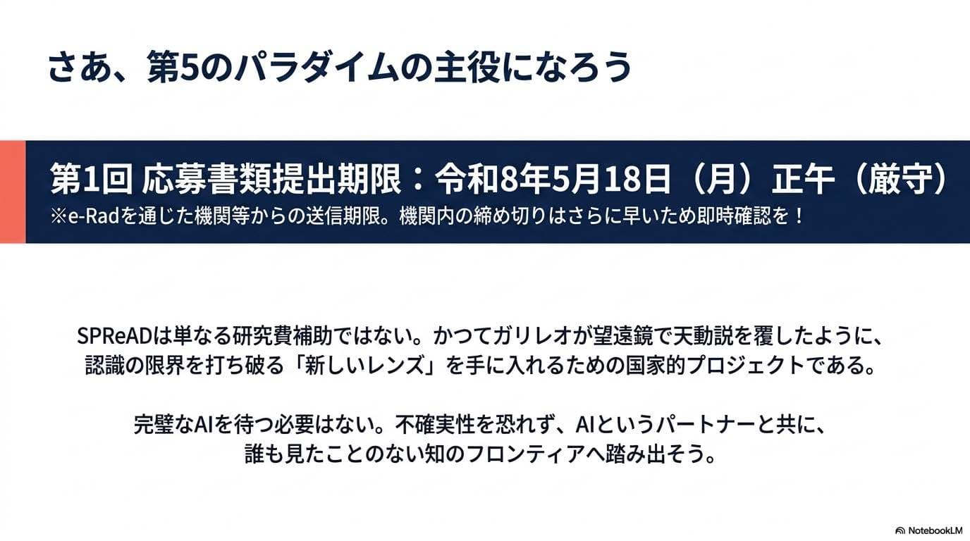 本稿の内容をベースに筆者がYouTube向けにNotebookLMで制作した解説動画。科学史における「第5のパラダイム」の位置づけから、SPReADの制度的特徴、そして採択を勝ち取るための3つの作法と応募5ステップまでを、整理している。記事と合わせて視聴することで、制度の全体像が立体的に理解できる構成である。