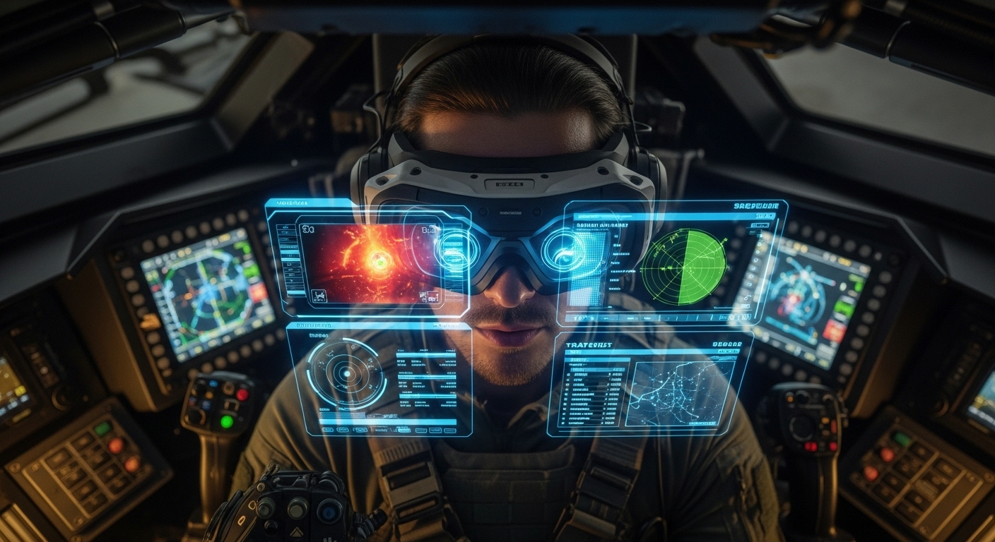 Distance Technologiesが開発した軍用車両向けのAI強化ARシステム。複数のセンサー情報を統合し、戦闘環境での状況認識と意思決定を支援するヘッドアップディスプレイ。