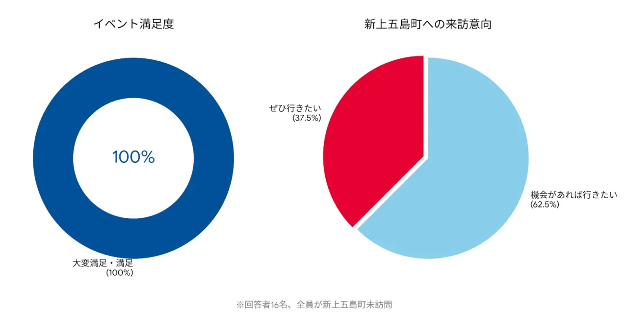 当日参加者16名全員がアンケートで「実際に行きたい」と回答し、満足度も100%だった。「ぜひ行きたい」が37.5%、「機会があれば行きたい」が62.5%を占めた。会場では360度VR映像、現地リアルタイム中継、特産品「かんころ餅」の提供を組み合わせた体験を実施した。
